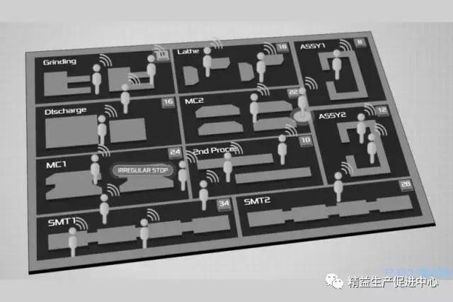 制造现场的可视化发展(振荡器)的独立技术引进。可以通过在人或物、制具、工具等安装标签,由位置信息和MES结合,通过信息系统可以实时掌握现场运行情况。生产线上每时每刻的产量变化和人的部署一目了然。