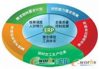 ERP是 MRP II(企业制造资源计划)下一代的制造业系统和资源计划软件。除了MRP II 已有的生产资源计划、制造、财务、销售、采购等功能外,还有质量管理,实验室管理,业务流程管理,产品数据管理,存货、分销与运输管理,人力资源管理和定期报告系统。
