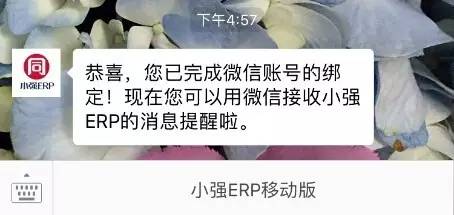 从系统后台左侧个人设置下拉栏里,点击“微信绑定”,同时,您的微信端即可收到一个绑定成功的通知,点击“小强ERP移动版”即可进入主页面。