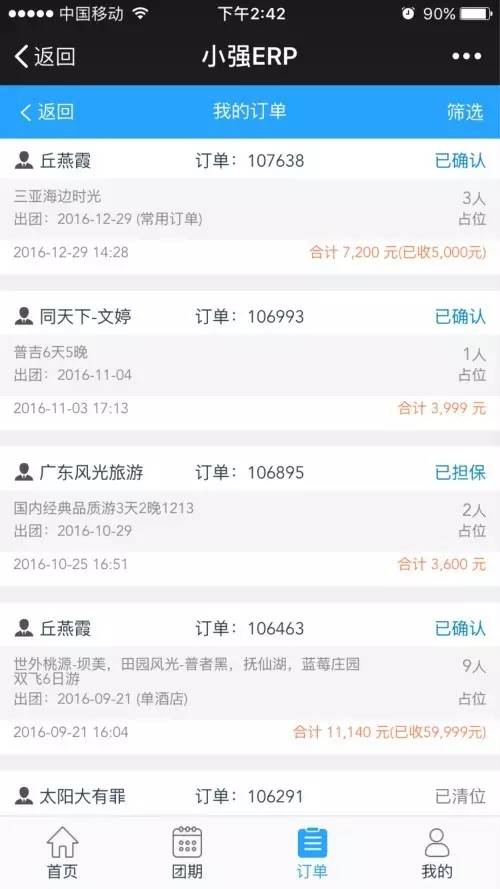 实时掌握所有订单的进度、查看订单详情(订单信息、订单人数、订单金额、客户信息、人员信息等);