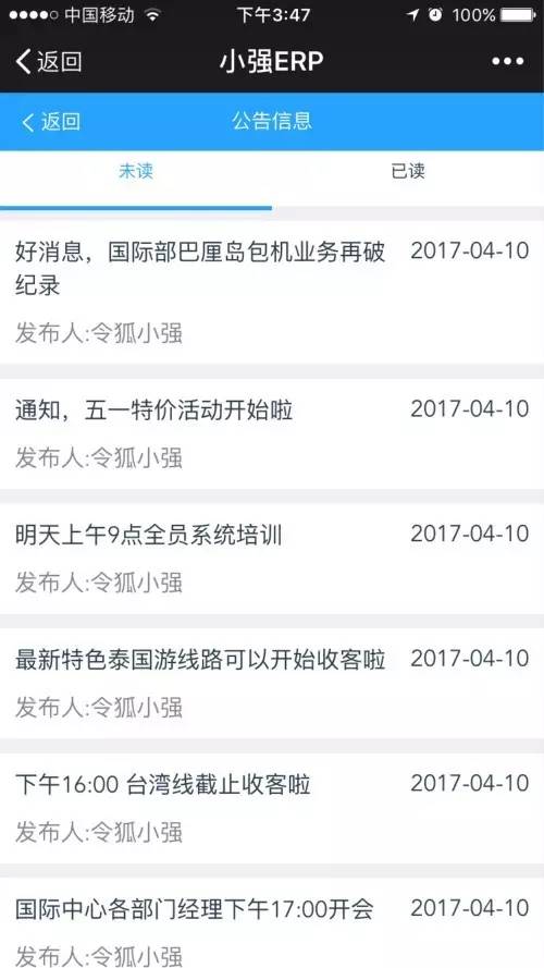 无论是公司各项会议、培训公告,还是业务上的订单截至收客通知、突发事项通知等,都能通过“公告信息”功能第一时间发送给全员。