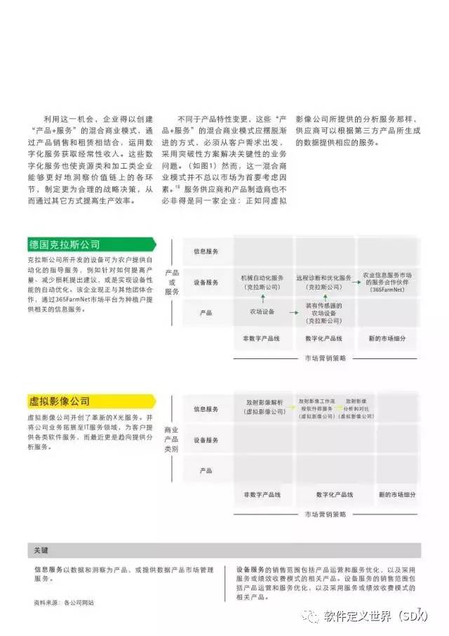 报告将借助一个矩阵结构对现有企业的产业物联网发展现状进行了分析,其横坐标分别由:非数字产品、数字化产品线、新的市场细分所组成;其纵坐标则由:产品、设备服务、信息服务所组成。依托这个分析架构,该报告逐一讲解了通用电气、米其林、德国克拉斯公司以及虚拟影像公司,目前在产业物联网领域中的发展现状。报告认为“产业物联网的重要亮点之一即为运营效率的提升,这也是早期的关注点。”但随着其调研的深入,愈来愈发现产业物联网的价值已经开始纳入到企业提升运营效率的相关战略中,而对于那些致力于推出全新数字式产品和服务的企业而言,产业物联网同样孕育着巨大的潜能,即创造全新的收入来源,以及改善企业营收和盈利能力。