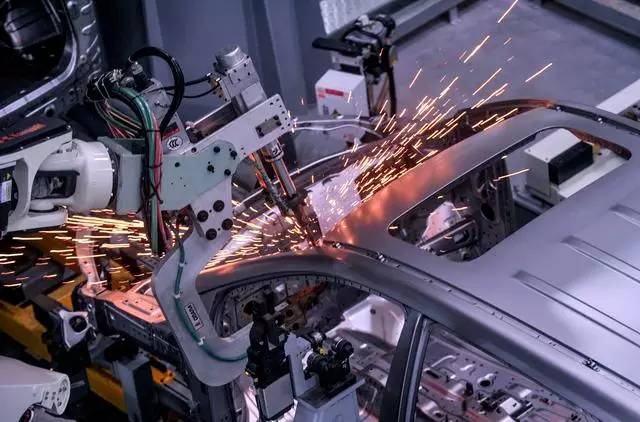 焊接车间采用同平台多车型柔性共线生产、蓝光自动检测、EMS传输、激光在线检测