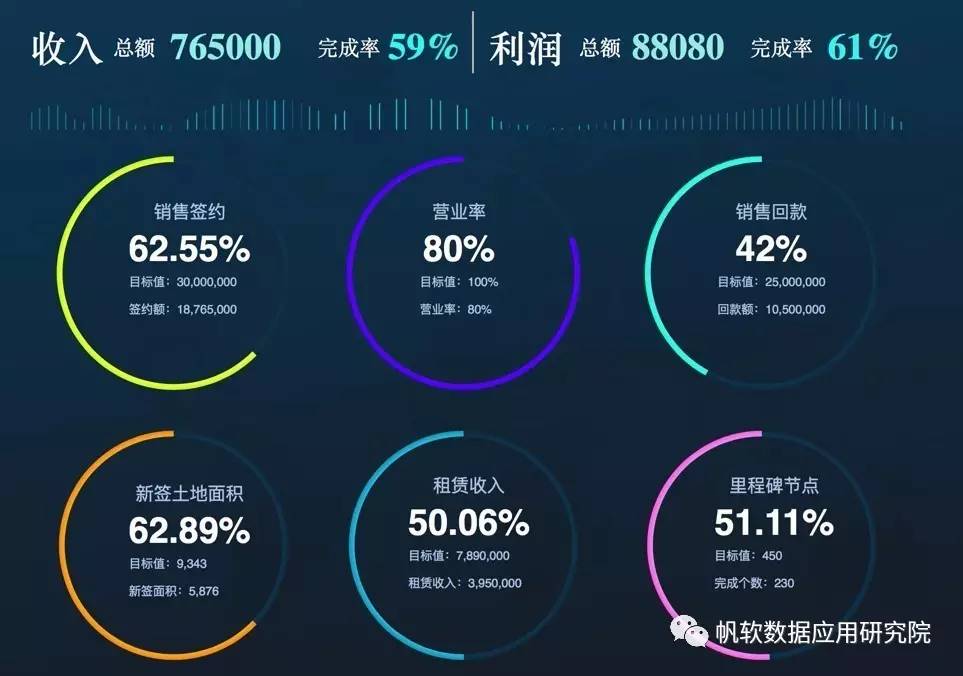 运作层:战略的的最终落实来自业务运作执行。运作层反映业务执行效率和目标完成情况,帮助员工更好的开展日常工作,发现增值点,监控问题点。比如不同区域、不同销售人员的销售目标完成进度等。