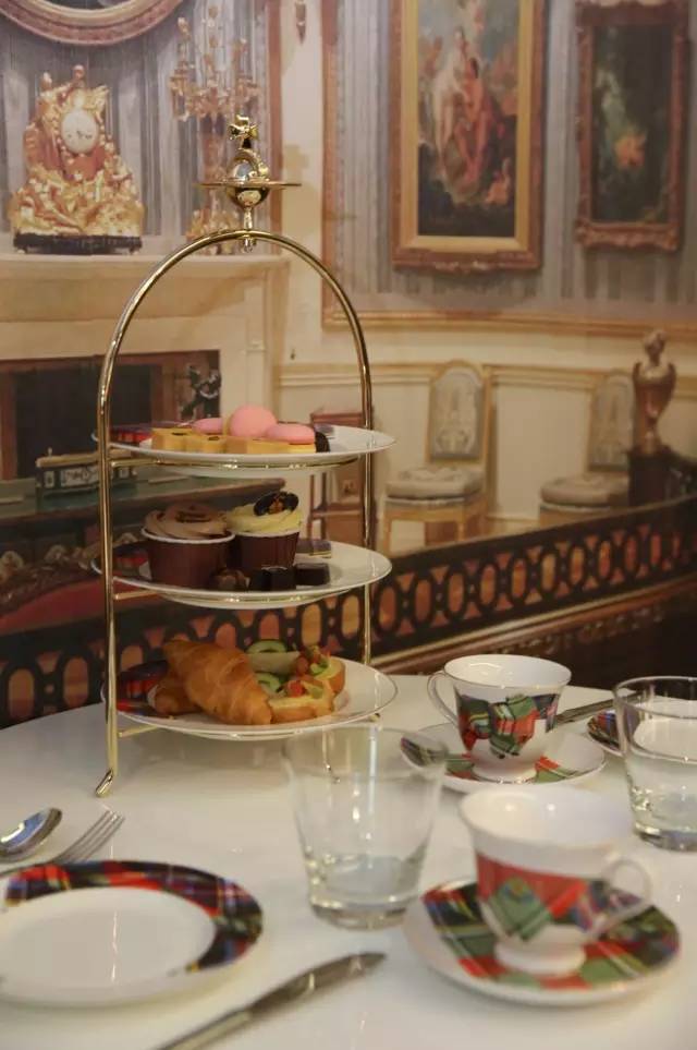 木质桌椅,带着苏格兰tartan格纹装饰的漂亮茶具带出浓浓的复古感。