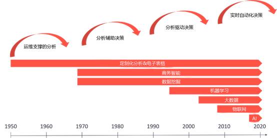 通过数据挖掘方法、数据仓库、客户端/服务器系统以及最终的大数据存储的创新,分析的作用进一步增强,这一发展导致了分析驱动的决策。例如,在维修行业,状态监测成为常态。状态监测导致关键传感器数据的可视化,从而使人们对设备状态和关键任务(如要替换哪个轴承)进行实时查看和执行。