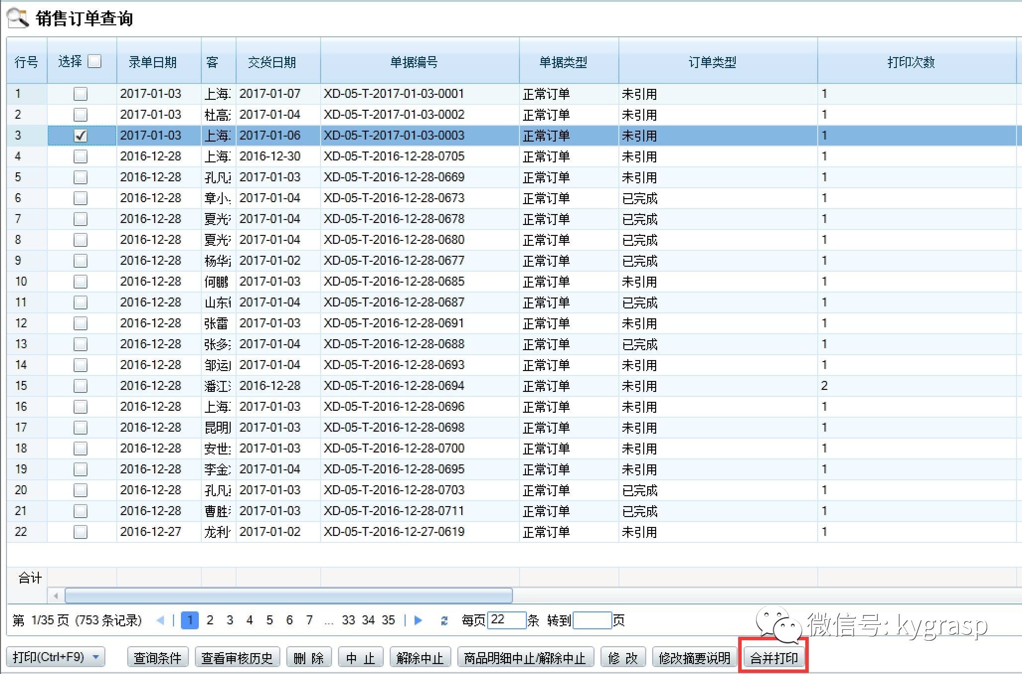 根据此客户具体需求,制定开发单据合并打印解决方案如下:销售订单查询页面,新增合并打印功能,如图: