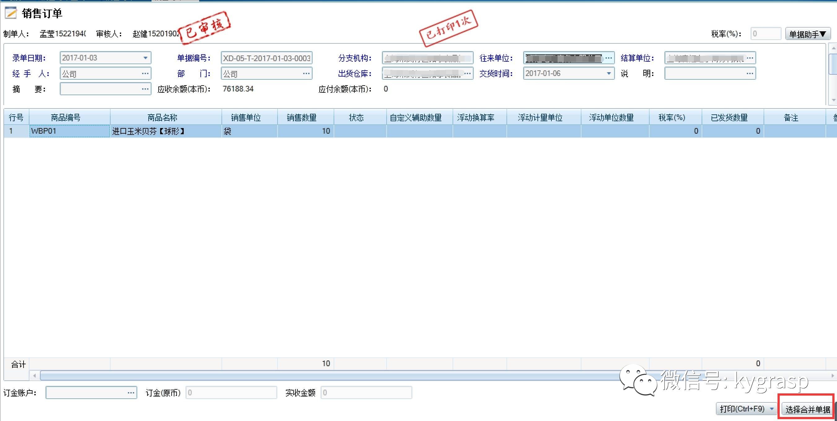 此页面选择需要合并的单据,可以根据单据类型,单据日期等进行筛选选择。点击确定后,页面如图: