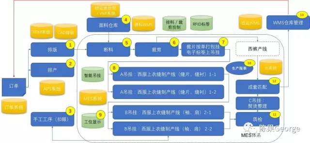8、吊挂线控制系统根据APS排产的逻辑,将吊钩上的裁片或半成品传到相应的产线和工位上。前述示范工厂分为三段生产,吊挂线也相应分为三组,第一组吊挂线对应两条缝制线(缝衬等平面缝制),后续第二组吊挂线对应两条缝制线(缝肩等成型缝制)。