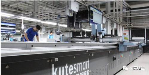 定制则需按订单对单片断料裁剪。红领采用了数码裁床,排版信息直接传到裁床,裁剪软件通过投影仪投射到裁床上的面料上,由人工开裁,这样就无需传统的纸版(这种数码裁床十多年前就挺普及了);最后一台裁床上,把不同订单采用同一面料的裁剪工作集中排版开裁。据我观察,红领并没使用顶尖的数码自动裁床。