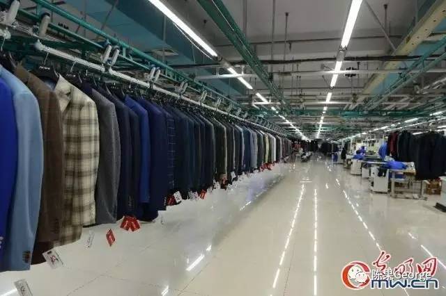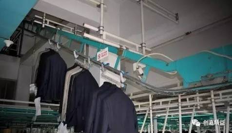 12、西裤生产线在另一个车间,通过另一段挂架系统传输过来,一套西服的上衣和裤子在挂架汇合处被自动分拣成套。
