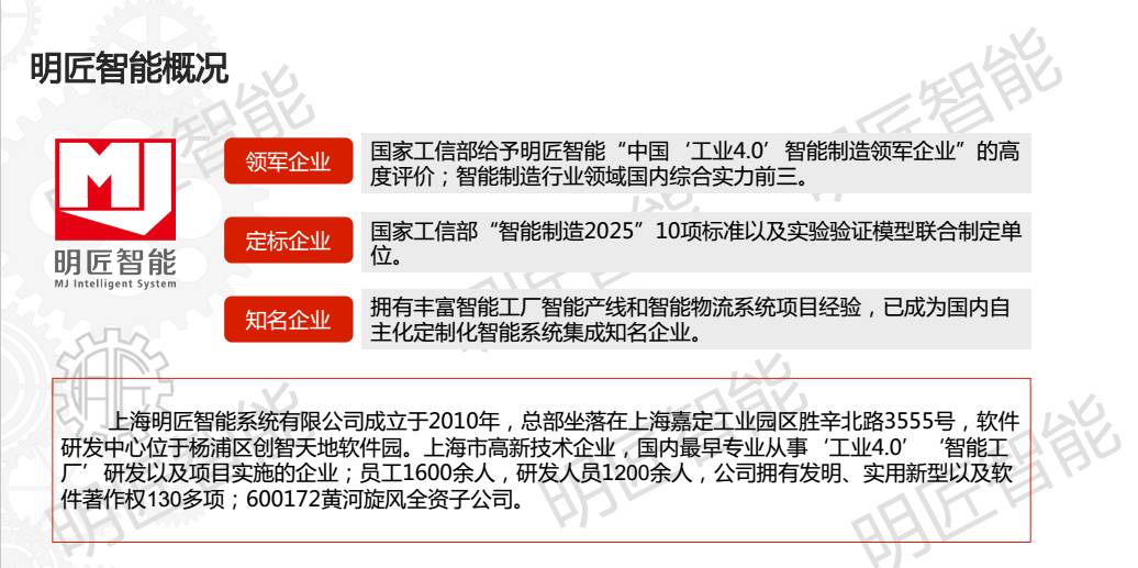 上海名匠智能系统有限公司:中国工业4.0智能制造领军企业。国家工信部2025十项标准、实验验证模型的联合指定单位,拥有丰富智能工厂产线和物流的项目。