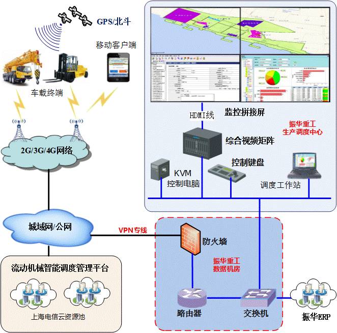 流动机械及生产人员移动终端通过中国电信4G网络接入流动机械智能调度管理云平台,同时该平台通过VPN专线对接振华ERP系统及生产调度中心。