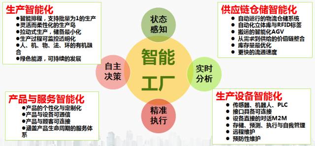 智能工厂的特点包括状态感知、实时分析、自主决策和精准执行,从企业产品的全生命周期来看, 可以分为生产设备智能化、生产智能化、供应链仓储智能化和产品与服务智能化等几个方面。
