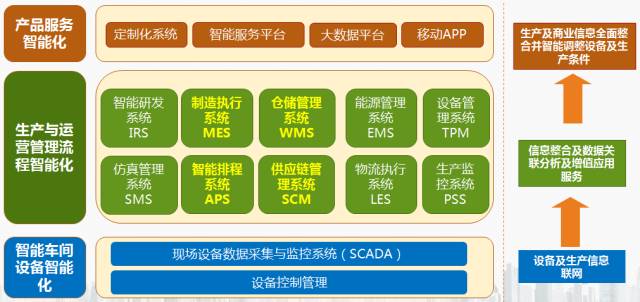 从智能工厂的总体框架来看,可以从下往上分成智能车间设备智能化、生产与运营管理流程智能化、产品服务智能化三层,每一层分别通过一系列系统的组合来实现该层的功能。总体实现的路线建议首先实现设备及生产信息联网并进行数据采集与监控,进而基于此实现信息整合及数据关联分析及增值应用服务,然后实现生产及商业信息的全面整合,甚至可以实现智能调整设备及生产条件。