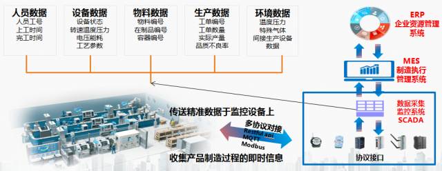 SCADA系统可以通过多种协议接口对接各种生产设备,从而收集手机产品制造过程中的即时信息,并向中层的制造执行管理系统传递和处理,然后把处理结果根据需要传递给ERP系统,同时也可以接受上层传递下来的控制数据信息,并把精准数据传送于监控设备上。