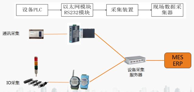 常用的数据采集包括通讯采集和IO采集两种方式,前者主要是按照指定通讯协议通过物理接口(RS232/RS485、以太网或其它通讯接口)对接设备控制器来进行数字化采集,后者常用于无开放通讯接口的一些设备,将通过传感器来对三色灯等模拟状态指示进行采集,两者采集后的数据将通过设备采集服务器向上层传递,中间可能通过光纤、NB-IOT等通讯技术来传输数据。