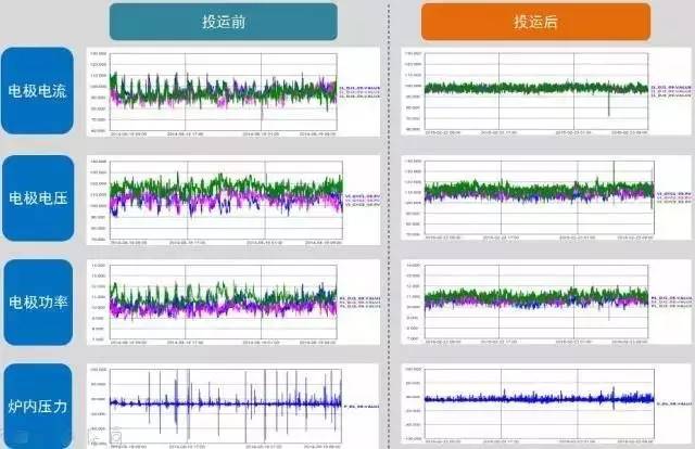 一对比就可以发现,通过智能化的削峰填谷,电流电压等数据更加稳定。据了解,该项目使每吨电石耗电率下降了2.37%,每年累计节能7.04万吨标煤!