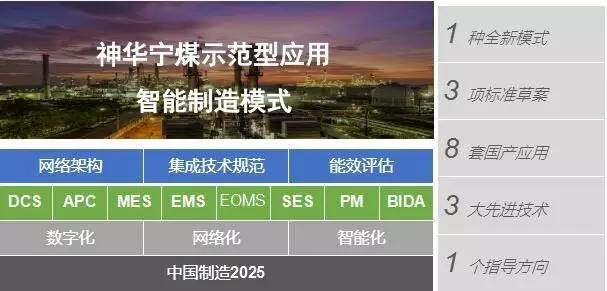 而在神华宁煤的智能制造项目中,中控推行了3项标准草案、8套国产应用和3大先进技术,以中国制造2025为指导方向,探索出了一种智能制造的全新模式——