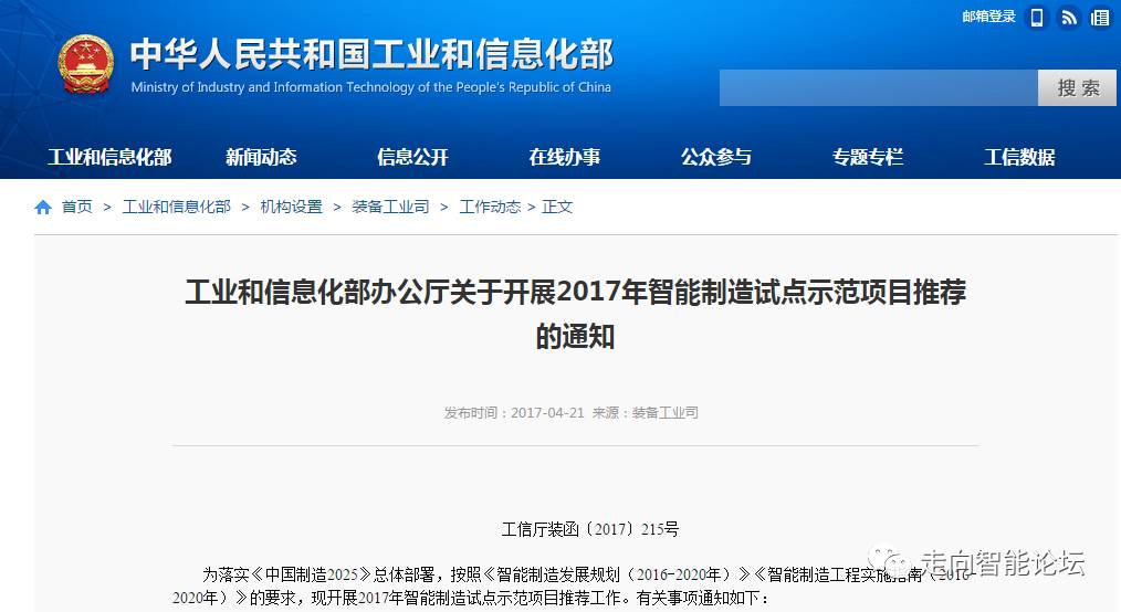 工信部官网今日权威发布《工业和信息化部办公厅关于开展2017年智能制造试点示范项目推荐的通知》,为落实《中国制造2025》总体部署,按照《智能制造发展规划(2016-2020年)》《智能制造工程实施指南(2016-2020年)》的要求,开展2017年智能制造试点示范项目推荐工作。本文来自:工信部官方网站,由《走向智能论坛》微信公众号推荐阅读。