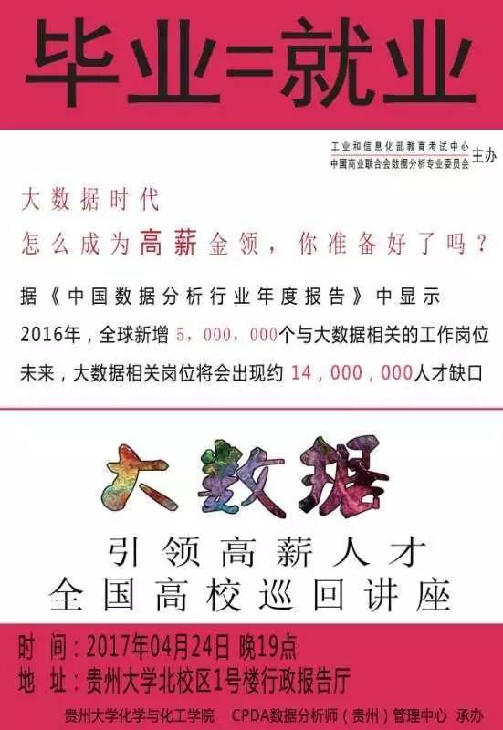 由中国商业联合会数据分析专业委员会联合工业和信息化部教育考试中心主办,贵州大学化学与化工学院承办的《2017大数据应用与就业指导全国高校巡回讲座》即将召开。将在贵州省各高校进行巡回讲座。