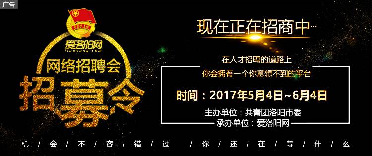 为迎接第68个五四青年节的到来,同时更好的促进洛阳青年的就业,由共青团洛阳市委主办、爱洛阳网承办的大型网络招聘会定于2017年5月4日~6月4日举行。