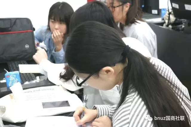 每个队伍都积极热烈地讨论经营策略、认真地记录表格、小心地填写数据,整个比赛现场气氛愈加紧张。