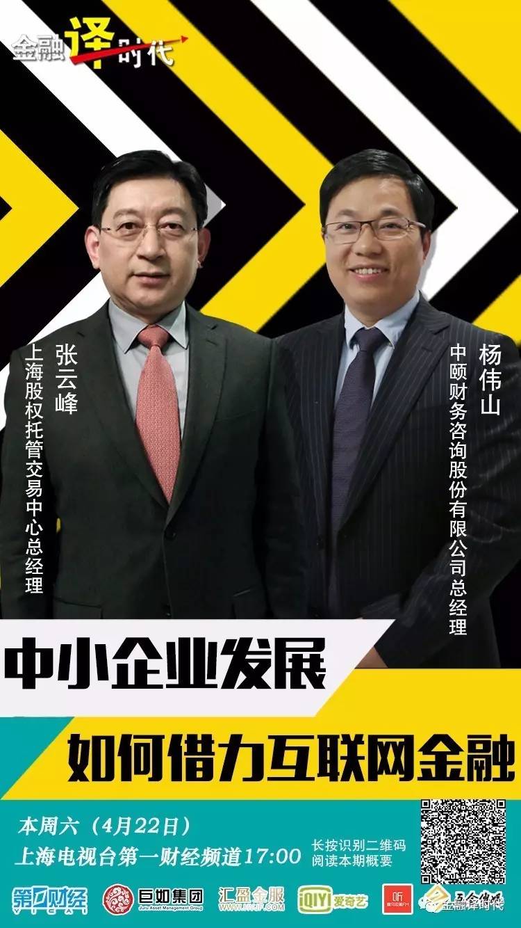 本期《金融译时代》邀请到上海股权托管交易中心总经理张云峰与中颐财务咨询股份有限公司总经理杨伟山,围绕“中小企业发展如何借力互联网金融”展开精彩对话。