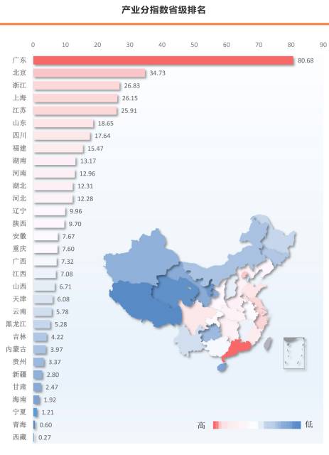 ? 产业分指数省级排名位次变化不大。广东和北京继续领跑全国。浙江超越上海,进入全国数字产业三强。北京、深圳、上海、广州四个数字一线城市产业分指数依然遥遥领先。