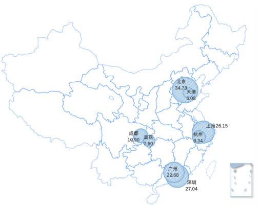 2016年,产业分指数、智慧民生分指数及云基础设施都呈现出下沉趋势。数字一线、二线、三线、四线、五线城市按照2016年产业分指数平均增速由低到高明显分成三个梯级。北上广深四个数字一线城市增速最低,四五线城市增速显著高于其他城市,构成增速最高的第三个梯级。同样的,数字四五线城市智慧民生分指数表现亮眼,2016年整体增速分别为147.23%、150.40%,高于二三线城市。在增速前100位的城市中,四五线城市占据了64席。