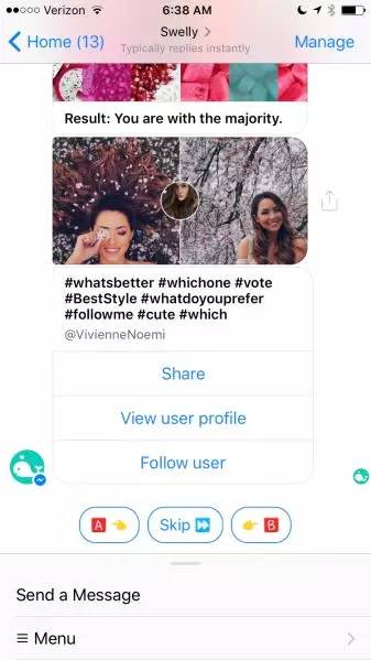 Swelly是一个机器人兼App,可以帮助企业或好友群创建并分享视觉化A/B测试问卷。它的开发商是Dvel,一家位于圣塔莫尼卡和奥地利维也纳的市场营销技术公司。