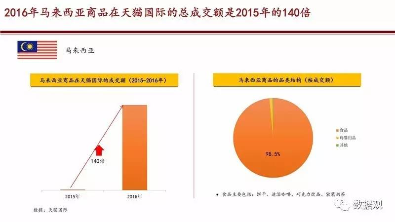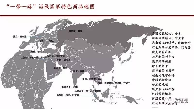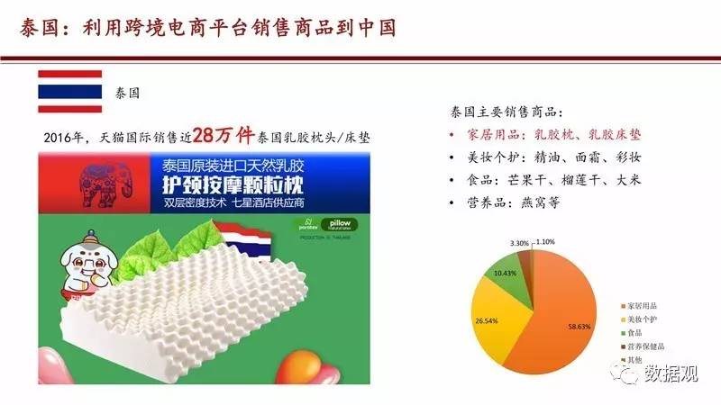 《报告》显示,中国消费者带火“网上丝绸之路”,中国的消费升级给“一带一路”沿线国家的商品带了巨大需求。2016年,共有124个泰国品牌在天猫国际平台上销售,与2015年相比,总成交额同比增长152%。其中,乳胶枕、乳胶床垫销售最火,在天猫国际平台上销售近28万件,这让作为世界第一大橡胶生产国的泰国在相当程度上抵消了原料价格走低的不利影响。此外,以饼干、速溶咖啡和袋装奶茶为代表的马来西来食品,2016年也在天猫国际上收获了成交额同比140倍的增长。还有印度的地毯、斯里兰卡的红茶、阿联茜的椰枣和捷克的粉底液,都因为跨境电商的带动进入中国消费者的购物车,