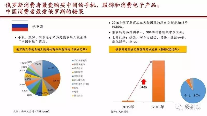 《报告》显示,俄罗斯“剁手党”购买力最强,中俄跨境电商往来更加密切。跨境电商连接指数排行榜上,俄罗斯以出口指数高出第二名以色列近3倍的成绩位居榜首,手机、服饰、消费电子产品是当地消费者最青睐的中国产品。与此同时,中国消费者也对俄罗斯表现出越来越浓厚的兴趣,天猫国际数据显示,俄罗斯商品2016年的销售总额是2015年的34倍,而2016年通过飞猪平台购买机票前往俄罗斯的人数也增涨到2014年的13.9倍。