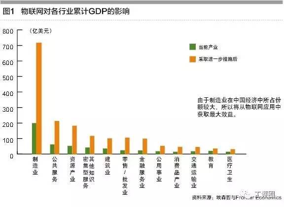就中国而言,若基于当前的政策以及投资趋势,保守估计,截至2030年,将有5000亿美元的GDP是来自物联网的。如果提高采用物联网技术的能力和投资,估计这一数值可达到1.8万亿美元。在制造业板块中,也将累计带来7360亿美元的GDP。
