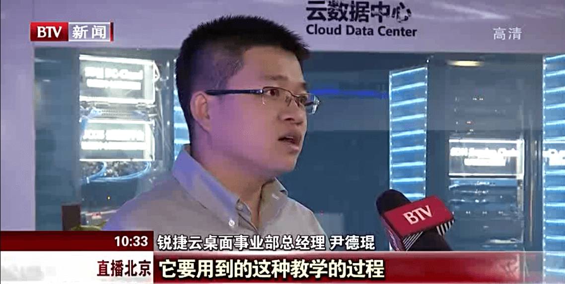 锐捷网络云桌面产品事业部总经理尹德琨接受了北京电视台记者的现场采访。他谈到:“我们把桌面虚拟化技术和计算机教室用到的教学过程相结合,通过加速技术,在30秒内即可完成课程的切换。针对一些学校比较复杂的应用,通过不断的优化,可以很好的进行适配。”