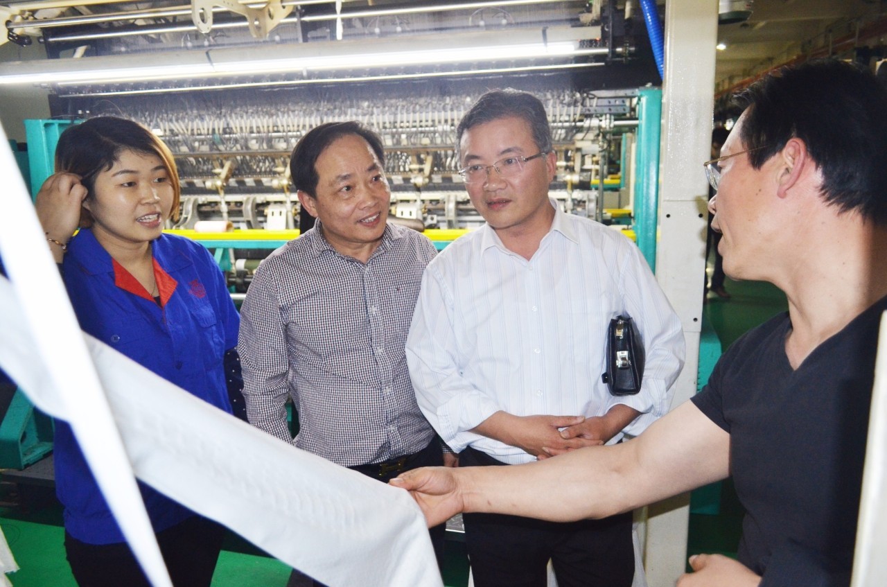 在经编智能全成形服饰生产基地,钱局长一行对任意一台智能经编机都能够实现纱线上机、立体编织,服装一次成形且无任何拼接,款式花型任意定制的服装全新生产模式感到很新奇。
