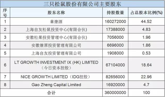 另外,据招股书披露,三只松鼠创始人章燎原(食业君注:招股书为章燎源)直接持有本公司44.52%的股份,通过燎原投资间接控制本公司 1.86%的股份,通过松果投资中心间接控制本公司 1.96%,合计控制本公司48.34%的有表决权的股份,系三只松鼠的控股股东及实际控制人。