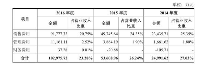 2014 年度、2015 年度以及 2016 年度三只松鼠的销售费用分别为 23,435.71 万元、49,745.64 万元以及 91,777.33 万元,占营业收入的比重分别为 25.35%、24.35%以及20.75%,报告期内整体销售费用呈现逐年下降趋势。