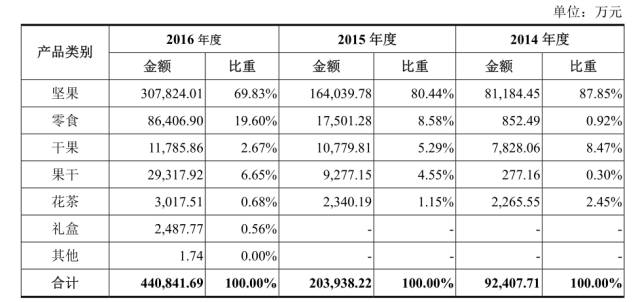 报告期内,公司坚果品类产品销售收入绝对值实现大幅增长,但占主营业务收入比重从 2014 年度的 87.85%逐年下降至 2016 年度 69.83%,零食和果干等产品销售收入占比则显著提高,公司产品组合愈加多元化。