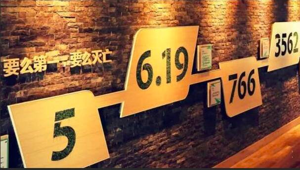特意用黄色灯光和灰色砖块做出旧时光效果的走廊,雕着标语“要么第一,要么灭亡”,一串数字连起一条时间轴:5个人创立的公司,2012年6月19日上线,2012年11月11日卖出766万元销售额。到2014年11月11日,单天销售额变为1.09亿元,2014年全年销售额突破10亿元。