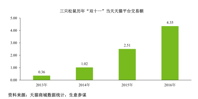 三只松鼠于2012年6月上线,此前没有一家线下门店。它仅用了65天的时间,便超过百草味,坐上了一把手的交椅,并在双11当天创造了近3600多万元的销售业绩。