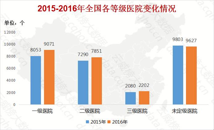 “云威榜-重庆互联网大数据分析中心”监测到,2016年,我国一级医院、二级医院和三级医院数量快速增长,未定级医院数量小幅减少,表明我国卫生行业管理日趋规范,医疗水平逐步提高。