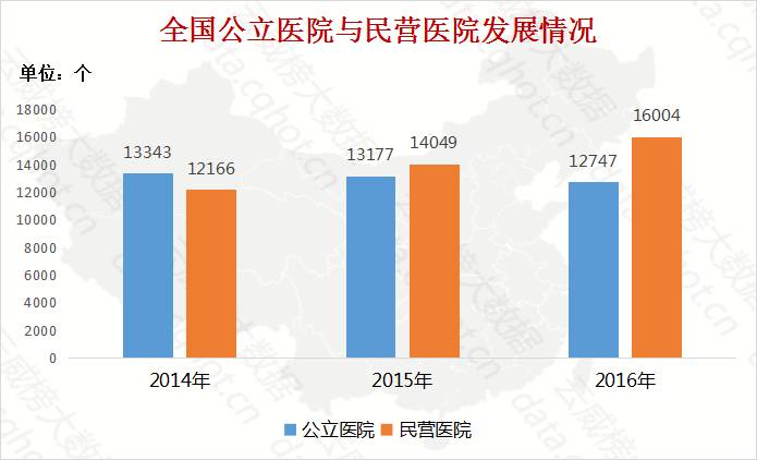 2014至2016年,我国公立医院数量逐年减少,民营医院数量大幅增多。截止2016年底,公立医院减少596个,民营医院新增3838个,民营医院数量已远超公立医院。