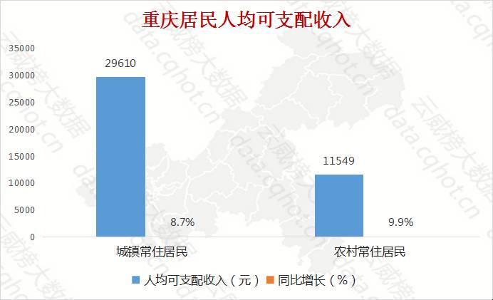 截止2016年底,重庆城镇常住居民人均可支配收入为29610元,同比增长8.7%;农村常住居民人均可支配收入为11549元,同比增长9.9%。
