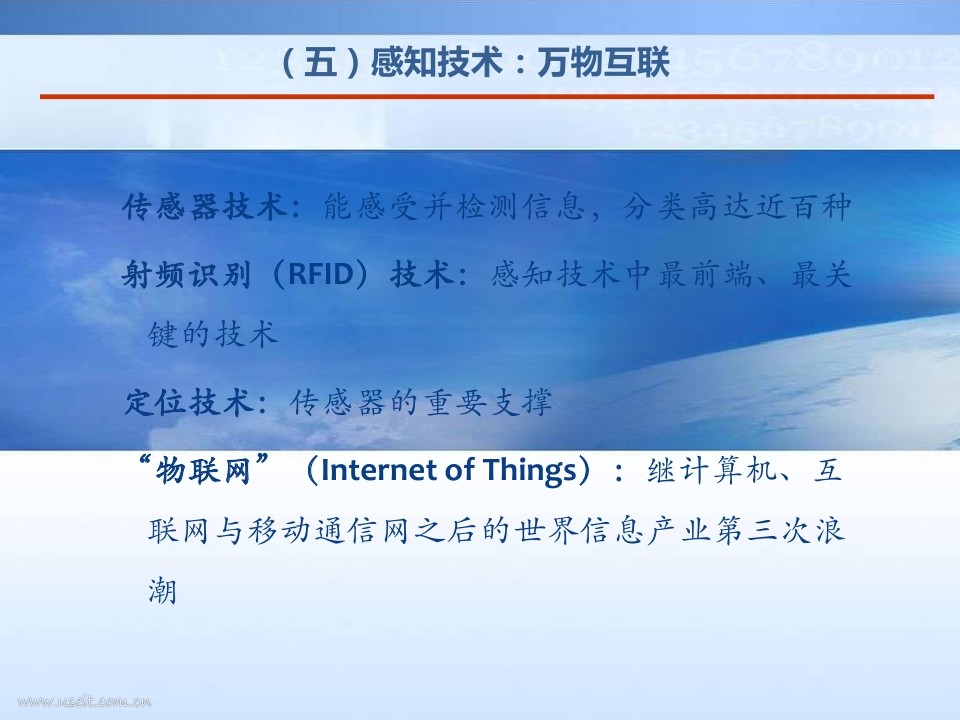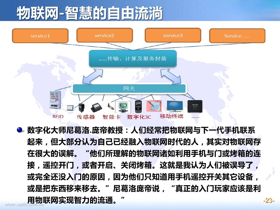 数字化大师尼葛洛.庞帝教授:人们经常把物联网与下一代手机联系起来,但大部分认为自己已经融入物联网时代的人,其实对物联网存在很大的误解。"他们所理解的物联网诸如利用手机与门或烤箱的连接,遥控开门,或者开启、关闭烤箱。这就是我认为人们被误导了,或完全还没入门的原因,因为他们只知道用手机遥控开关其它设备,或是把东西移来移去。"尼葛洛庞帝说,"真正的入门玩家应该是利用物联网实现智力的流通。