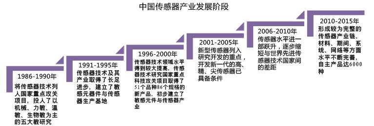中国已经基本形成较为完整的产业链结构,在材料、器件、系统、网络等各方面水平不断完善,自主产品已达6000种,国内建立了三大传感器生产基地,分别为:安徽基地,陕西基地和黑龙江基地。政府对国内传感器产业提出了加快力度加快发展的指导方针,未来的传感器发展将向着智能化的方向改善。