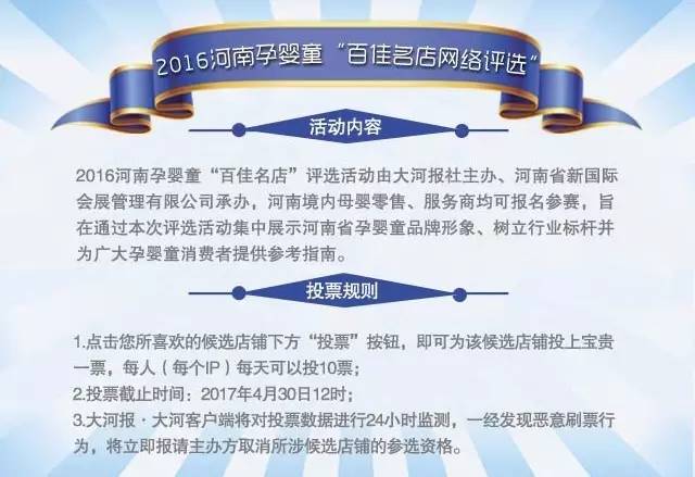 大河报记者登录页面后,首先看到的是“2016河南孕婴童‘百佳名店网络评选’”的醒目标题。下面紧跟着有“活动内容”、“投票规则”。根据规则,找到您所喜爱的孕婴童门店后,在其下方有“简介”、“投票”、“得票”三个链接,点击“投票”即可完成投票。需要提醒的是,每个IP每天可以投10次,可以投给不同的门店。这次参评的150个孕婴童门店,都是从上千个报名参评的门店中精挑细选出来的。根据活动规则,投票结果由网络投票和评审委员会成员评审两部分组成。“百佳名店”评审组织委员会成员由专家学者、主管部门、行业协会、消费者代表、参选门店代表等组成。评选成绩在1至100名的,将获得“2016河南孕婴童百佳名店”的金字招牌。据了解,“百佳名店”投票结果将于5月2日在大河报、新媒体集群公布。“百佳名店”荣誉获得者将在大河孕婴童展展会现场获得授牌、证书,大河孕婴童展将于5月19日至21日在郑州国际会展中心举办。