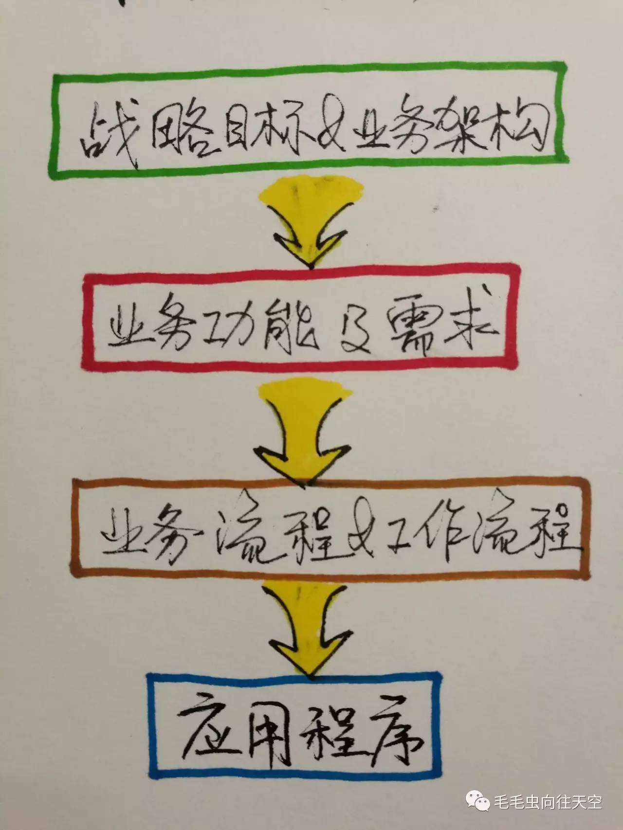 制定解决方案有哪些步骤呢?我们来画个线路图,一提取战略目标和业务架构的精髓,二制定业务功能及需求,也就是蓝图,三明确相关业务流程及工作流程,四实施到具体的应用程序中;业务、功能、技术、实施四个视角,层层递进、逐步展开、相辅相成,如下图。