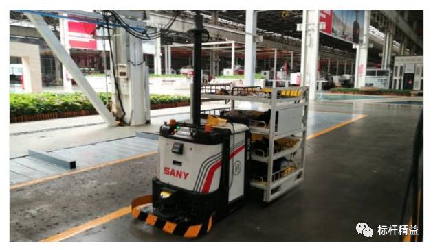 这台AGV(自动引导小车)在操作员发出取货指令后,它自动行驶至液压台取货,然后再激光引导下,它还将根据运行路径沿途的墙壁或支柱上安装的高反光性反射板的激光定位标志,计算出车辆当前的位置以及运动的方向,从而将物料运送至指定工位。像这样的AGV小车,在三一重工18号厂房有20台。