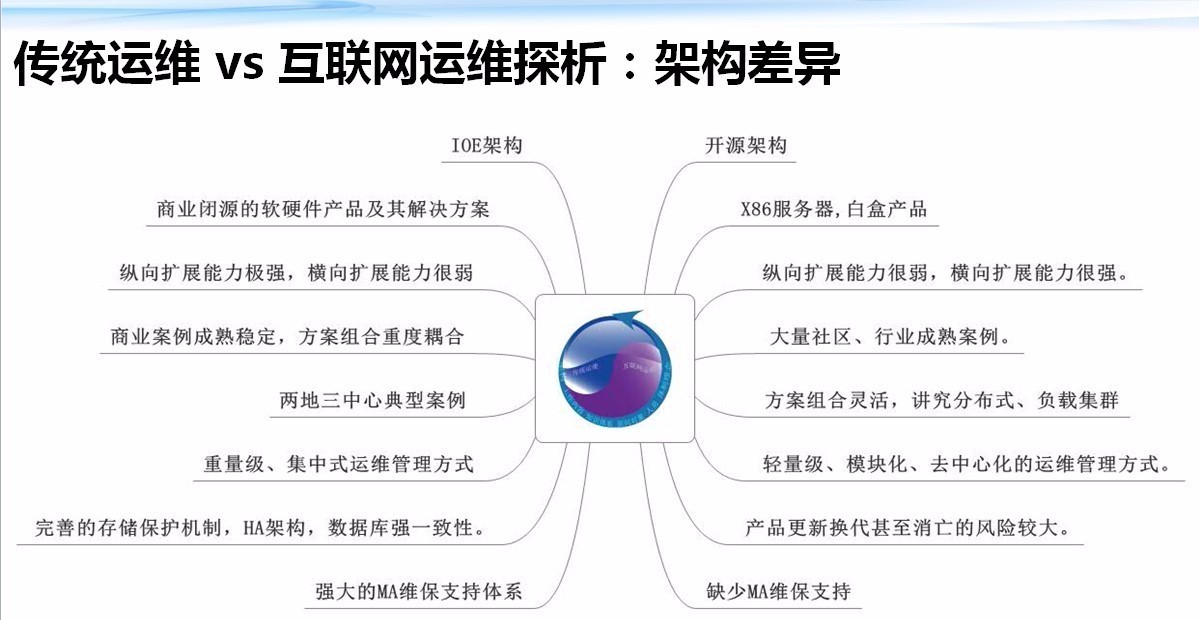 从上述架构简析中,我们便会感知到两种运维体系的巨大差异。可以说基于IOE架构的传统运维体系,与基于开源架构的互联网运维体系,是当前两大运维阵营。